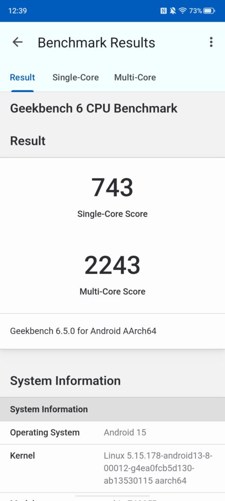 nubia S2RのGeekbench 6のスコアは、1回目がシングル:740、マルチ:2235、2回目がシングル:743、マルチ:2243でした。