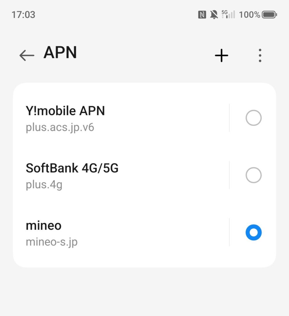 実際にソフトバンク回線のSIM(mineo)を差してみたところ、APN情報を手動で入力すれば通話やデータ通信ができるようになりました。